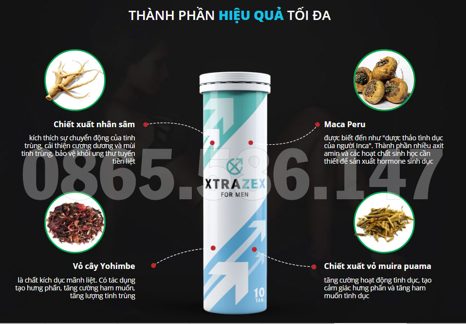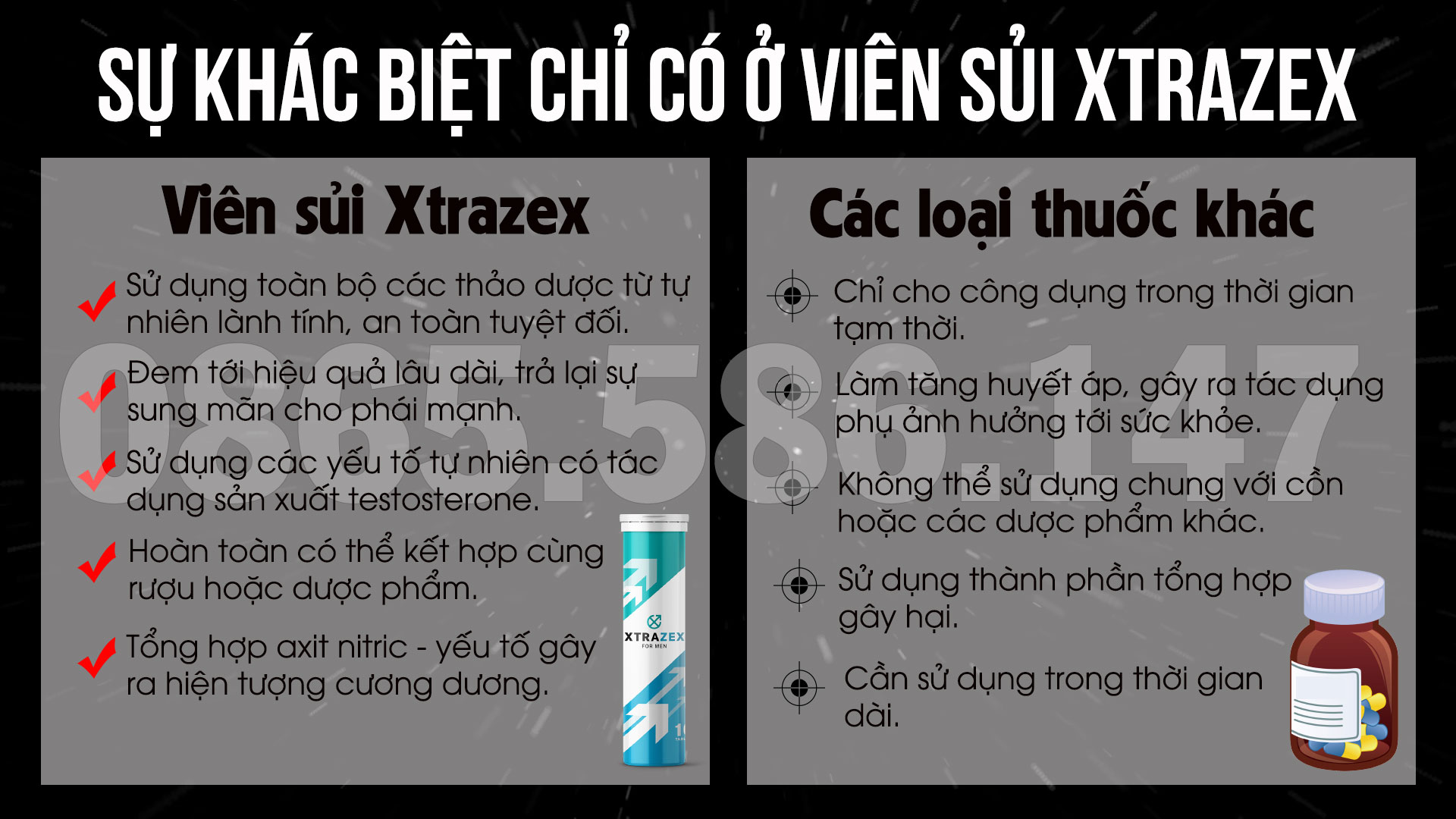 Viên sủi chống xuất tinh sớm Xtrazex được biết tới là sự pha trộn hoàn hảo của những thành phần được chiết xuất từ thiên nhiên, giúp nam giới lấy lại được vị thế của mình trên con đường giường chiếu. Đặc biệt, trong thành phần của thuốc cũng chứa khá nhiều chất phức hợp giúp kích thích khả năng hoạt động tình dục, nâng cao ham muốn, tăng khả năng sinh lý rất tốt.
